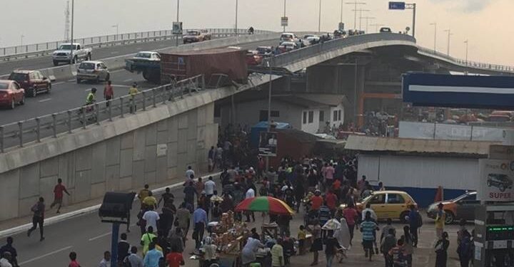 A truck carrying a 40-footer container, has toppled over the guard rails of the Kwame Nkrumah Circle interchange in Accra, destroying some vehicles beneath the overpass.
