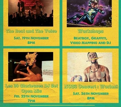 This special Friday night Open-mic session will also give the opportunity to upcoming rappers and hip-hop lovers to share the stage with Les 30 Glorieuses on Friday 25th November, 2016, 7PM. Rate: GHC 20 / GHC 10 for students & AF members / free under 16 For the closing concert of the Hip Hop Festival, join Worlasi for the NUS3 Concert. Nus3 is the title of Worlasi’s debut mix tape/ album translated as Strength Within and it will be headlined by Worlasi alongside artists featured on the mix tape/album and other talented acts. Rate: GHC 20 / GHC 10 for students & AF members / free under 16 Sponsors: Bacardi Partners: Yoyo Tinz , Embassy of France in Ghana, Institut Francais, Ibis Styles Hotels, Brussesls Airlines, Accra City Hotel, Wigal Solutions.