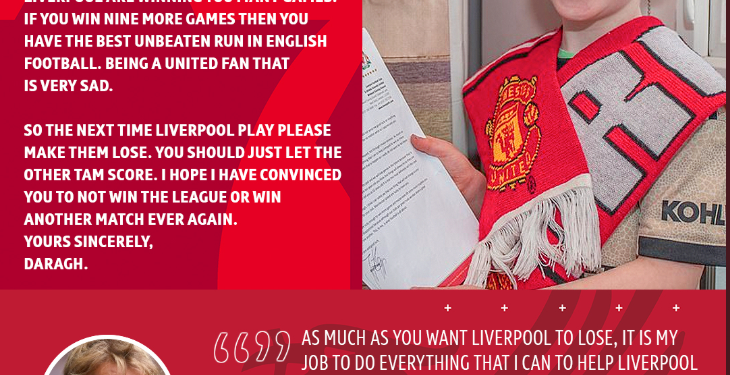 10 year old Man Utd fan Daragh from Donegal wrote a letter to Liverpool boss Jurgen Klopp asking him to stop his team winning so often.