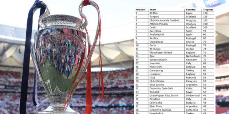 Uruguay’s Club Nacional de Football (113) and Atlético Peñarol (108) are third and fourth respectively, while Celtic holds down fifth place with 105 trophies.