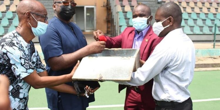 Director General of the National Sports Authority (NSA), Prof Peter Twumasi on Wednesday March 03, 2021 formally handed over the Theodosia Okoh National Hockey Stadium to the Contractor and officers from the Ghana Hockey Association and Ghana Gas Company to begin renovation.