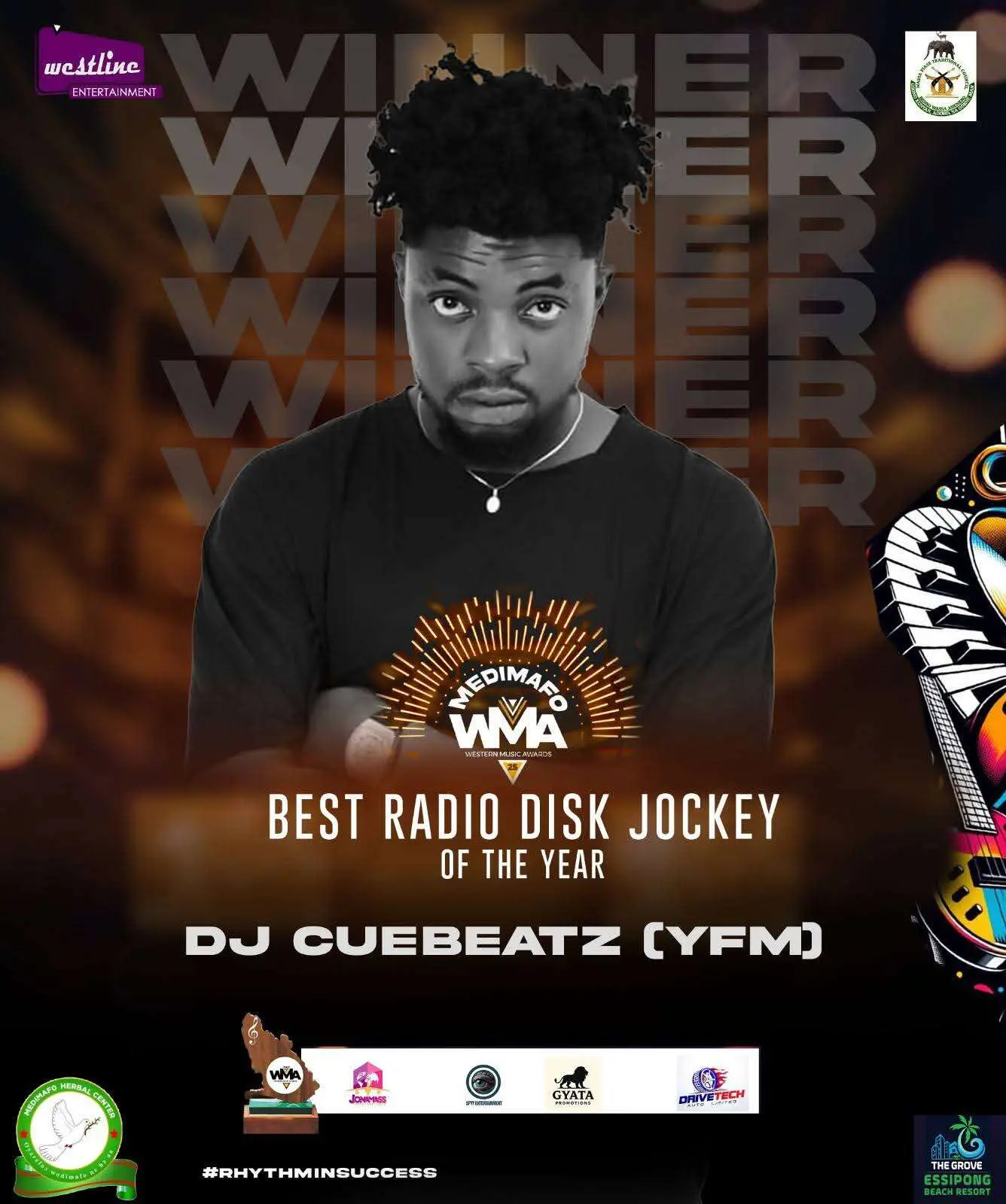 Renowned radio DJ and on-air personality, DJ Cuebeatz of Y97.9FM Takoradi has been crowned Best Radio Disc Jockey of the Year at the 2025 Medimafo Western Music Awards (WMA), cementing his position as one of the most influential radio DJs in the Western Region.