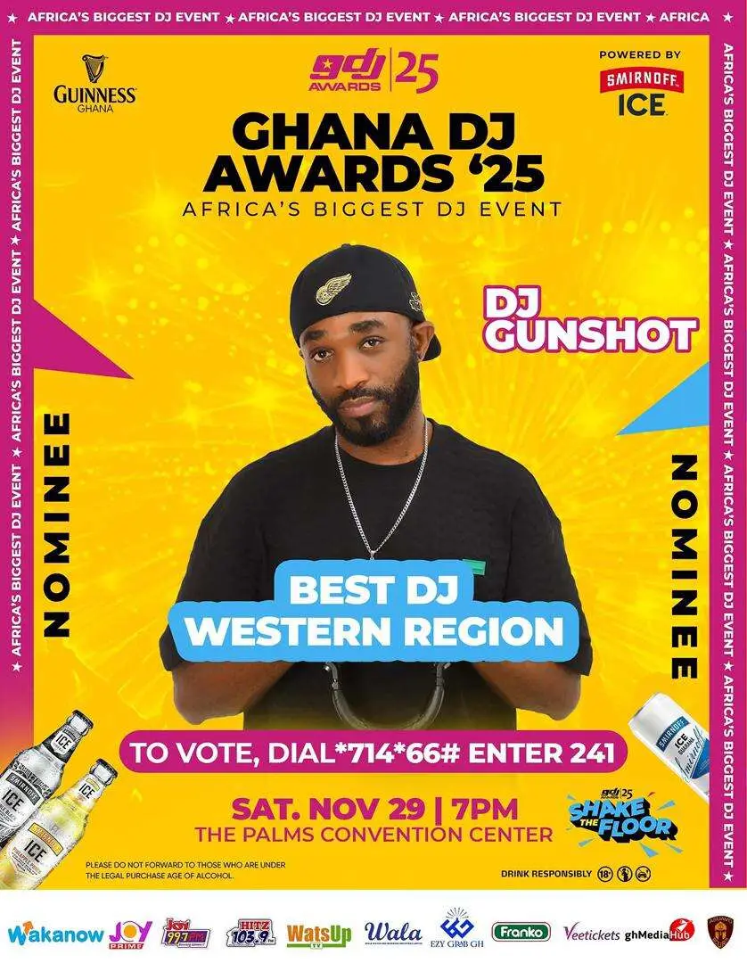 Support DJ Gunshot to bring home the Best DJ, Western Region award. Simply dial *714*66# and enter 241 to cast your vote.