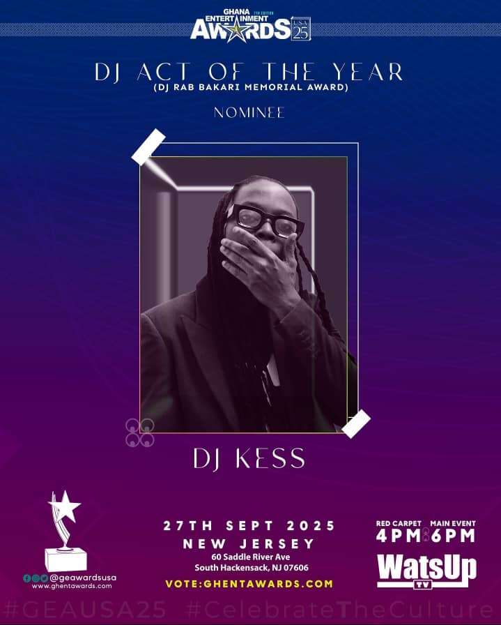 DJ Kess, Head of Music for YFM 107.9FM Accra, has been nominated for DJ Act of the Year (DJ Rab Bakari Memorial Award) at the Ghana Entertainment Awards USA 2025. The awards ceremony will take place on 27th September 2025 in New Jersey, United States.