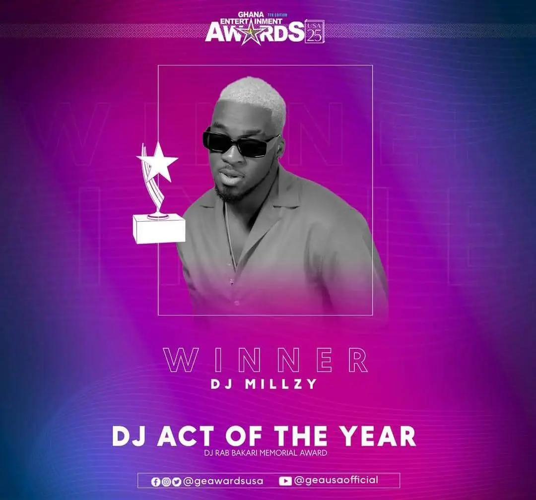 Ghana’s vibrant urban music scene has another reason to celebrate as DJ Millzy, resident DJ of Y107.9FM’s flagship ‘Dryve of Your Lyfe’ show, has been crowned ‘DJ Act of the Year’ at the 2025 Ghana Entertainment Awards-USA.